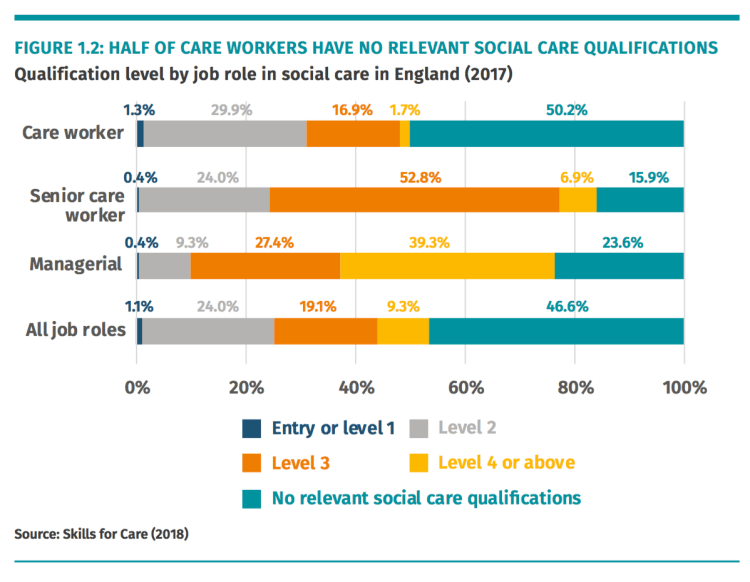 • While social care is a vital service and a skilled task, there are no effective minimum training requirements for care workers, and half of care workers have no relevant social care quali cation. There are currently limited opportunities for progression in social care.