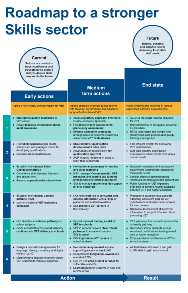 It proposes a new vision for vocational education in Australia as a modern, applied and fast-paced alternative to classroom-based learning. This Review recommends a six point plan for change and a roadmap for achieving it. The plan seeks to deliver a stronger skills sector which is a positive choice for many more Australians, whether they are starting their working lives or need new skills to advance their career.