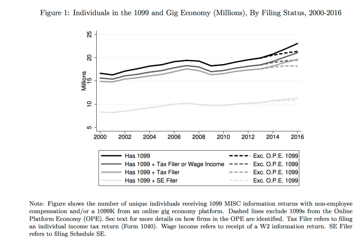 We examine the universe of tax returns in order to reconcile seemingly contradictory facts about the rise of alternative work arrangements in the United States. Focusing on workers in the “1099 workforce,” we document the share of the workforce with income from alternative, non-employee work arrangements has grown by 1.9 percentage points of the workforce from 2000 to 2016. More than half of this increase occurred over 2013 to 2016 and can be attributed almost entirely to dramatic growth among gigs mediated through online labor platforms. We find that the rise in online platform work for labor is driven by earnings that are secondary and supplemental sources of income. Many of these jobs do not show up in self-employment tax records: approximately 44 percent of the overall growth in the 1099 economy comes from people who do not file self-employment taxes. Examining the relationship between 1099s and self-employment tax records more generally, we find that the previously documented increases in self-employment tax filings since 2007 are largely driven by workers without 1099s. We discuss implications of these findings for tax administration and measurement of alternative work using tax data.