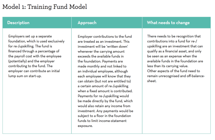 Employers set up a foundation exclusively for re-/upskilling, nanced through a percentage of payroll costs, with no set nal bene t per employee. When employees leave, they can take their share with them to support continuous learning.