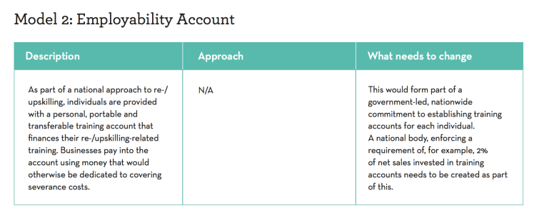 As part of a nationwide approach to re-/upskilling, individuals are allocated a personal, portable and transferable training account, out of which they can pay for re-/upskilling- related training. From an accounting perspective, companies pay a percentage of employment costs into the Employability Account using money that would otherwise be used for severance costs.