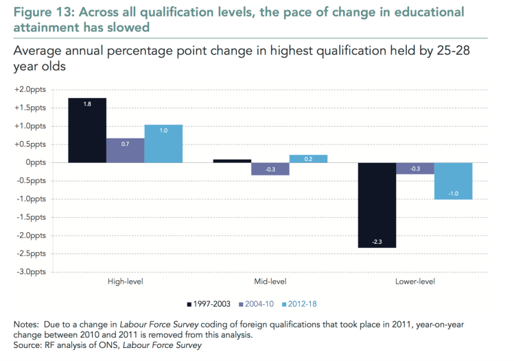 The pace of educational attainment growth has more than halved since the turn of the century, and this slowdown has been widely spread During the late 1990s and early 2000s, the quali cations held by young people owing into the labour market rose at an astonishing rate: year-on- year between 1997 and 2003, the average increase in the share of 25-28 year- olds with a Bachelor’s degree or higher grew by 1.8 percentage points; the share with GCSE grade A*-C equivalent or lower quali cations reduced by an average of 2.3 percentage points.
