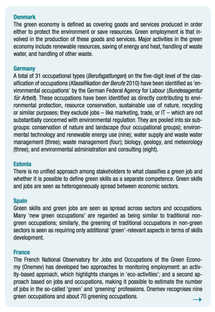 (a) since 2010, different countries have experienced different patterns in the development of green skills and jobs and have defined green jobs and green skills in various ways. This poses a particular challenge for skills anticipation if a reliable picture is to be built up across Europe regarding the supply of, and demand for, green skills. With that aim in mind, there appears to be an opportunity for countries to share their knowledge and understanding about how to de ne and estimate green skills; and subsequently about designing and implementing effective policy and training initiatives to foster green jobs and address respective skill needs;