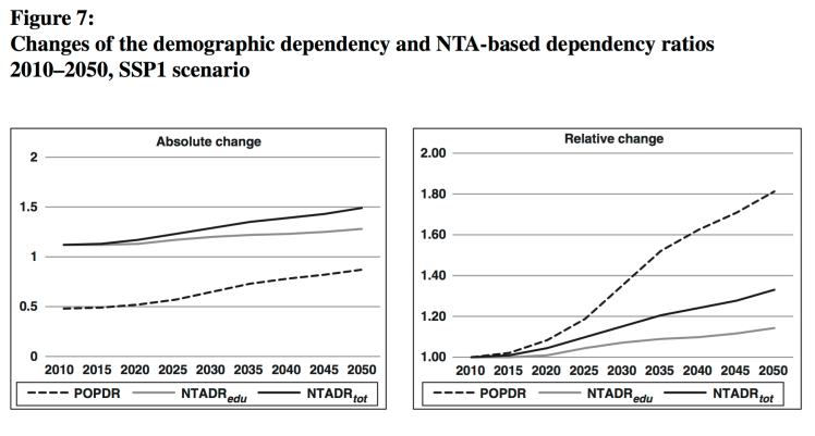 When studying the economic consequences of changes in the age structure of the population, looking at economic dependency ratios provides us with some descriptive and intuitive initial insights. In this paper, we present two economic dependency ratios. The first ratio is based on economic activity status, and relates the number of dependent individuals to the number of workers. The second dependency ratio relates consumption to total labour income. To build up the second ratio, we rely on the recently set up National Transfer Accounts (NTA) for Austria. Simulations of the employment-based dependency ratio with constant age- specific employment rates indicate that the employment-based dependency ratio will increase from 1.23 in 2010 to 1.88 in 2050, based on a population scenario that assumes low mortality, medium fertility and medium migration in the future. The corresponding values for the NTA-based dependency with constant age-specific labour income and consumption are 1.12 in 2010 and 1.49 in 2050. We then compare how the dependency ratio would differ if we accounted for the increasing levels of educational attainment. While the education-specific age patterns of economic activities are kept constant as of 2010, the changing educational composition up to 2050 is accounted for. In Austria, higher educated individuals enter and exit the labour market at older ages and have more total labour income than lower educated individuals. Our simulations of the education-specific economic dependency ratios up to 2050, based on the optimistic projection scenario of low mortality and high educational levels in the future, show that the employment-based ratio will increase to 1.68 and the NTA-based dependency ratio will rise to 1.28. These increases are still considerable, but are well below the values found when changes in the educational composition are not taken into account. We can therefore conclude that the trend towards higher levels of educational attainment may help to reduce economic dependency.