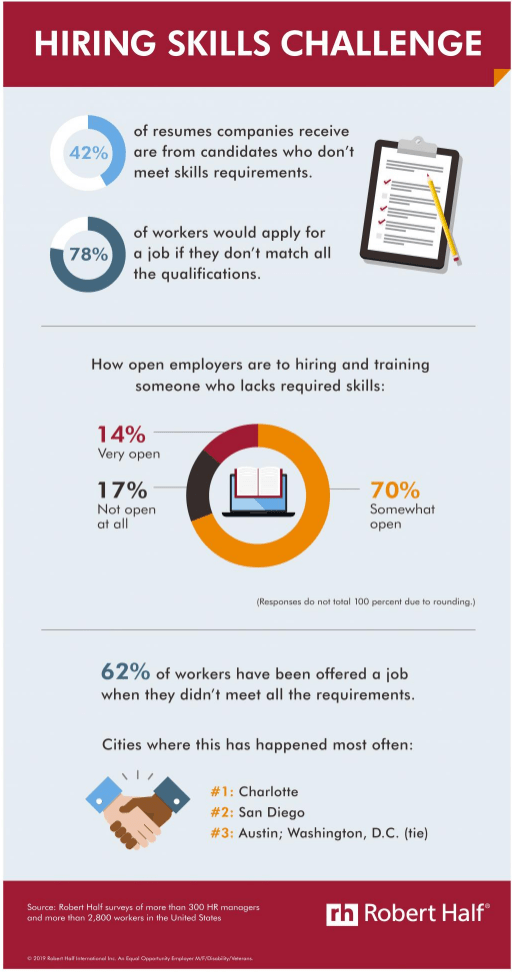 Should professionals mind the skills gap when applying for a position? In new research from global staffing firm Robert Half, HR managers said 42 percent of resumes they receive, on average, are from candidates who don’t meet the job requirements. In a separate survey of workers, 78 percent admitted they would submit for a role when they don’t match all the qualifications.