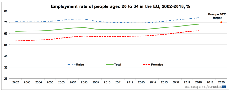 Chosen excerpts by Job Market Monitor. Read the whole story at Employment rate of people aged 20 to 64 in the EU reached a new peak at 73.2% in 2018