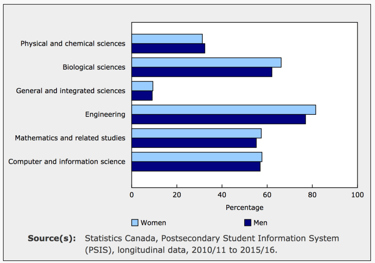 Women’s representation in STEM fields can be affected by choices and barriers at different stages of their education, including their initial field of study and whether or not they complete the degree. Once they enroll in a STEM program at university, are women less likely than men to persist in the same program until graduation?