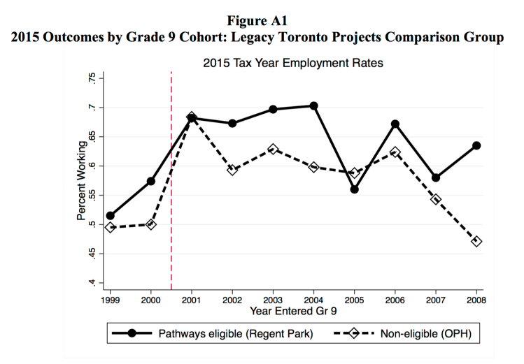 The research design compares the outcomes of individuals that were assigned to live in Regent Park during high school with students that were assigned to other Toronto public housing projects. To estimate long-term labor market outcomes, the authors matched high school administrative records to income tax records.