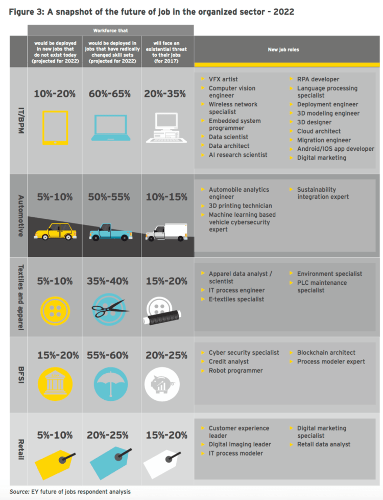 The future of jobs in 2022 in India will be determined by the country’s response to the inevitable impact created by the interplay of three primary forces – globalization, demographic changes and the adoption of Industry 4.0 exponential technologies by Indian industries. The impact of these three primary forces is expected to be disruptive on sectors such as IT-BPM and BFSI and relatively lower on core manufacturing sectors such as apparel and leather.