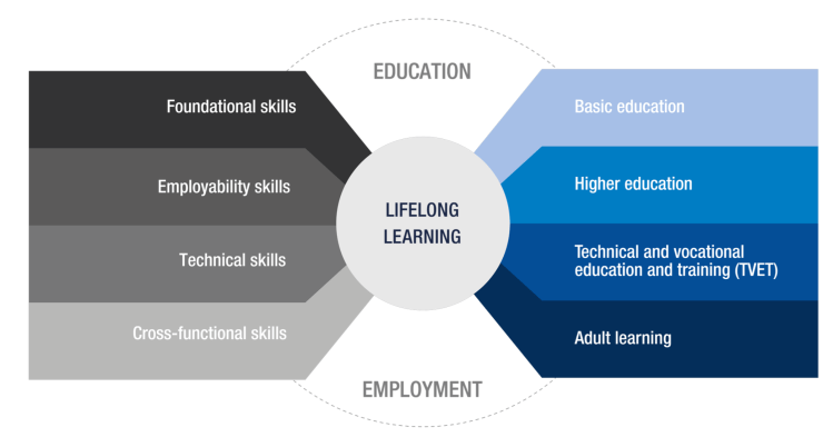 The four target areas follow a lifecycle approach to transforming education and training ecosystems and prepare businesses to successfully navigate and manage the new world of work. At its core, the lifecycle approach supports and promotes the concept of “lifelong learning”, which