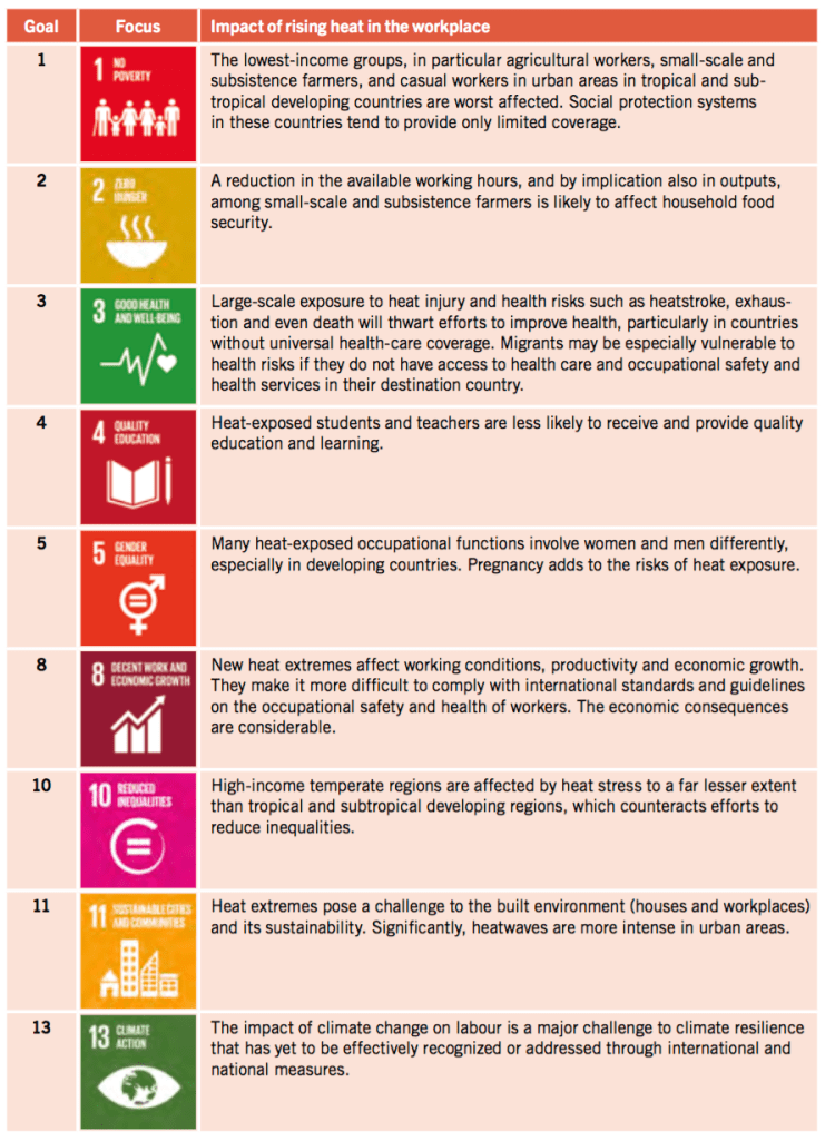 The challenges posed by climate change are a key focus of the ILO’s new Centenary Declaration for the Future of Work and will shape its operations and research agenda. The report demonstrates that the consequences are far-reaching for the UN’s 2030 Agenda . It warns that, “The economic, social and health effects of heat stress would make it harder to tackle poverty and promote human development, and, consequently, also to attain most of the United Nations Sustainable Development Goals (SDGs).”
