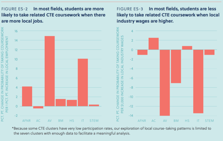 Students are also more likely to take courses in fields that support more local jobs, but less likely to do so when those jobs are high-paying, suggesting that today’s CTE is connecting kids with jobs that are plentiful but low-paying by industry standards.
