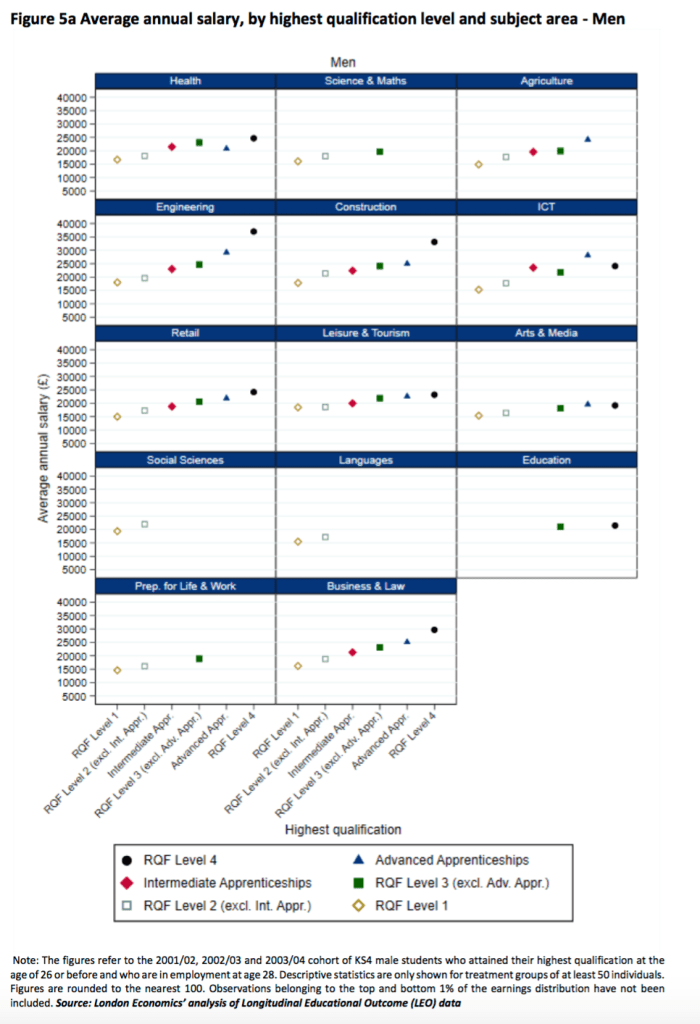 In this study, we investigate the value of progression associated with different vocational qualifications disaggregated by subject area of study. Previous analyses of labour market outcomes by subject of study demonstrated that estimates of labour market outcomes vary considerably by subject area, but this is in part as a result of the choice of counterfactual. In particular, the choice of the adjacent level of qualification (not controlling for subject of study) captures an ‘average’ return using learners with qualifications at the level below in any subject area in the counterfactual group. This approach does not take into account that learners tend to self-select in specific subject areas depending on their (observed and unobserved) characteristics and that transitions between completely different subject areas are unlikely to happen due to admissions criteria.