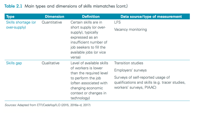 The usefulness of the term ‘skills mismatch’ has been criticised by the ILO (2017) as an overly generic umbrella term that hides different forms of mismatch, each with different manifestations, requiring different measurement methods and different policy responses. The term is used in relation to vertical and horizontal mismatch, skills gaps, skills shortages, and skills obsolescence. Some forms of skills mismatch have been the subject of extensive research initiatives, as demonstrated by the large number of published analyses on vertical mismatch (over-education, under-education, and to a lesser extent, also over-skilling). Other forms of mismatch, such as horizontal mismatch, skills shortages, skills gaps and skills obsolescence are less represented in the literature. Some concepts of skills mismatch have drawbacks and some measures are poorly correlated.