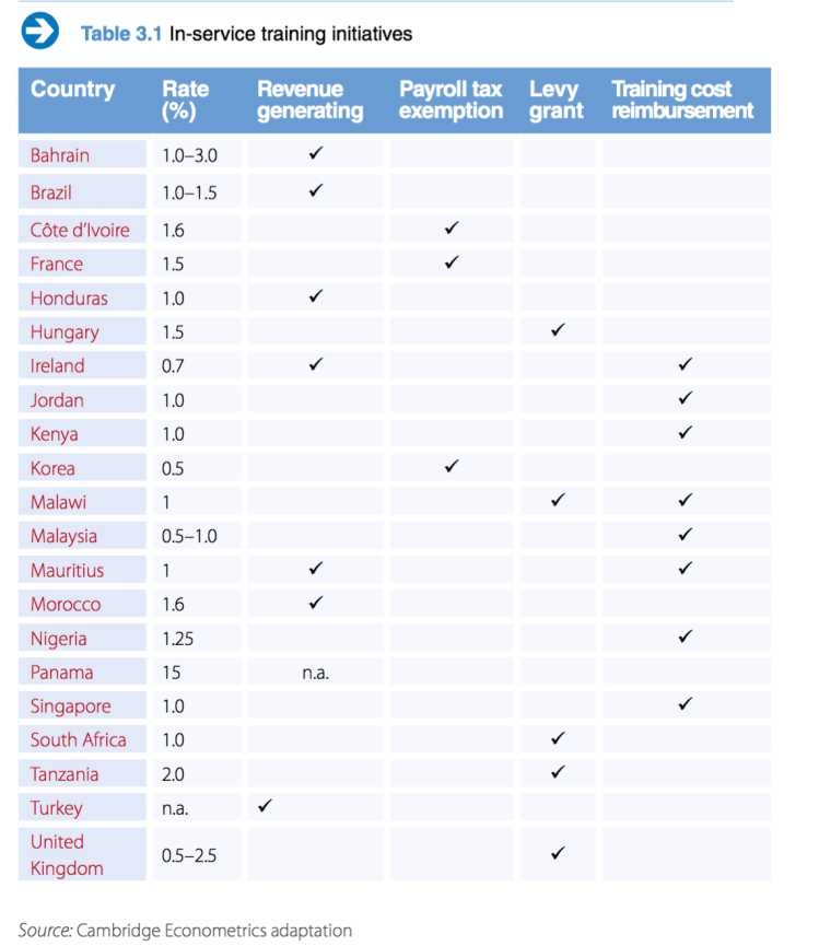 - Training levies are important tools to provide a pool of funding which can contribute to the advancement of human capital. The potential of this type of fiscal instrument is especially important for countries that have unstable public budgets.