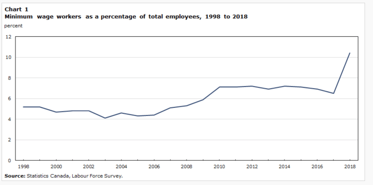 - Between 1998 and 2018, the proportion of employees earning minimum wageNote grew from 5.2% to 10.4%, with most of that growth occurring between 2017 and 2018. This coincided with notable minimum wage increases in Ontario, Alberta and British Columbia.