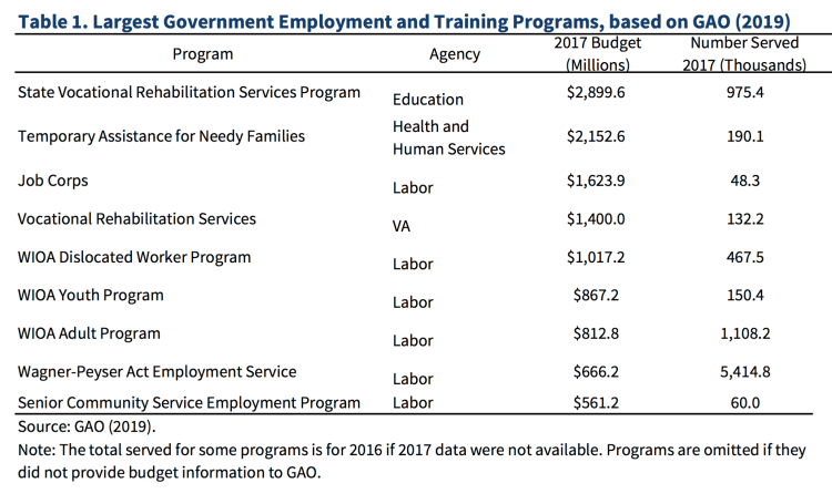 In accordance with the Executive Order Establishing the President’s National Council for the American Worker, the Council of Economic Advisers has prepared this report examining the evidence available on the effectiveness of government employment and training programs. According to the Office of Management and Budget, the Federal Government has 47 different employment and training programs spread across 15 different government agencies. Aggregate spending on these programs totaled $18.9 billion in 2019 alone.