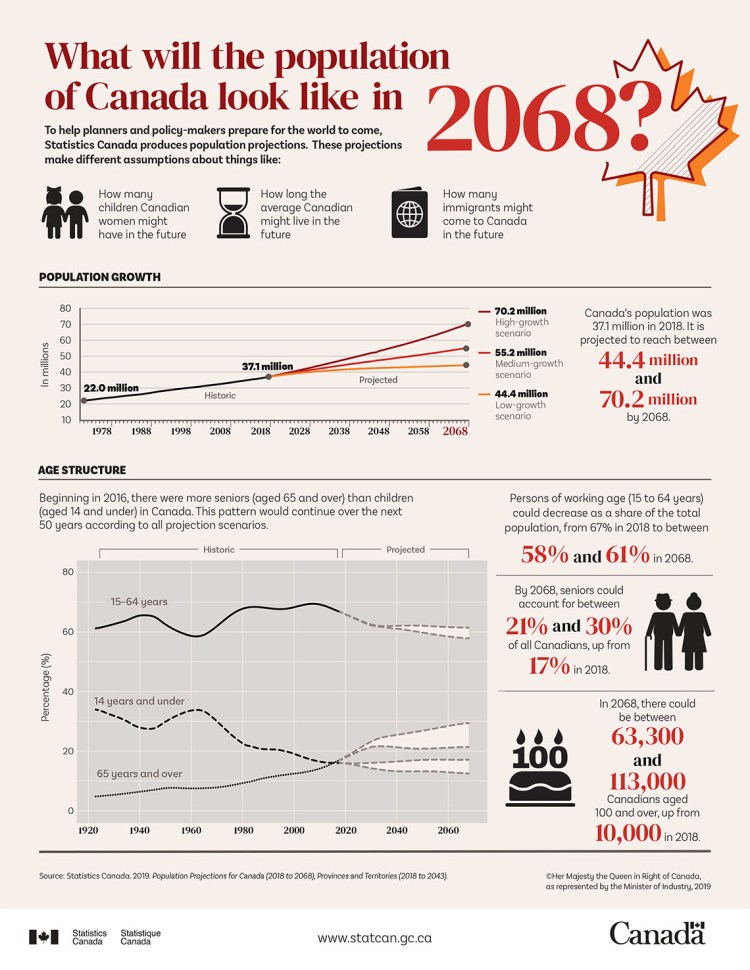 By 2068, the proportion of the population aged 65 and older would reach between 21.4% and 29.5%, depending on the scenario. In comparison, 17.2% of Canadians were aged 65 and over in 2018.