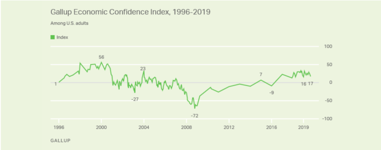 Americans’ confidence in the economy has become less rosy this month as Gallup’s Economic Confidence Index fell to +17 from August’s +24 reading, marking the lowest level since the government shutdown ended in January.