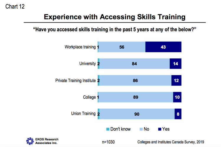 Respondents were then presented with a list of institutions and asked if they had accessed skills training from any of them in the past five years. Results reveal that most Canadians have not recently accessed skills training. Fewer than half (43 per cent) have accessed workplace training in the past five years, while less than one in six (14 per cent) have accessed training from a university. Only about one in 10 have accessed training from a private training institute (12 per cent), college (10 per cent), or union training (eight per cent) within the past five years.