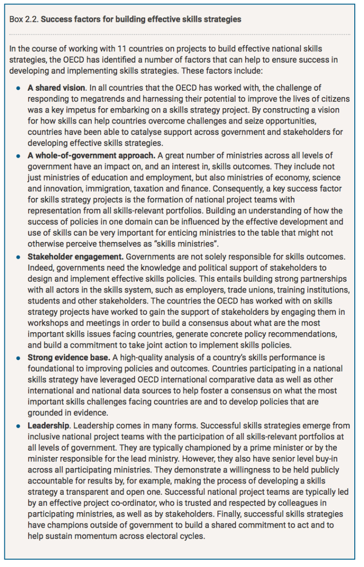 Since 2012, the OECD has embarked on an ambitious agenda to understand skills systems from a whole-of-government approach and identify good practices that lead to better outcomes, especially in a world where skills needs are changing substantially. This led to the development of the OECD Skills Strategy, which has since gone national. Its cross-government approach and recognition of the roles of other key stakeholders were designed to overcome the limitations of working in silos so that policies can be better aligned and co-ordinated in order to ensure a positive and substantial impact. It has also engaged stakeholders in the development and implementation of policies, learning from their expertise, creating a sense of ownership, and making them responsible and accountable for the roles they play. Work carried out in 11 countries have generated new insights and revealed some important barriers to success that need to be overcome in implementing skills policies.