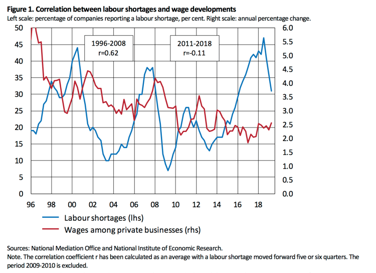 Nominal wage increases in Sweden have been unusually low in recent years, despite a strong outcome for the Swedish labour market. Several indicators point to demand for labour having exceeded supply, which according to the textbook should have led to higher wage growth. In this Commentary I show how survey- based indicators can have exaggerated the demand for labour in recent years, and thus exaggerated wage pressures. The analysis shows that Swedish companies raise salaries when they perceive it is difficult to obtain staff and that they raise salaries more the higher the shortage of labour. A new supplementary indicator shows that the shortage of labour may be lower than other measures are showing, and that this could partly explain why wage growth has been more subdued in recent years. However, the analysis does not fully explain why wage growth has been so low. It is therefore probable that other changes on the labour market have contributed to slowing down wage growth in recent years.