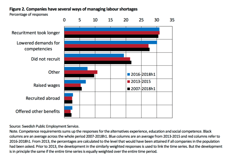 Figure 2 shows how the companies respond to the question about managing labour shortages. Seen across the whole period 2007-2018, the normal situation is that the shortage means it takes longer to recruit than before and that the companies need to lower their requirements regarding experience, education or social competence. It is also common that the recruitments are broken off completely. Other measures are also used. This could be that the company uses external recruiters, recruits to a different region, uses subcontractors or a staffing agency. Raising salaries comes in fifth place, seen across the entire time period. But it has become more common to raise salaries during the period 2016-2018 than it was in 2013-2015. It has also become somewhat more common for companies to lower their competence requirements or offer other benefits, while it has become less common for companies to break off the recruitment or take other measures.