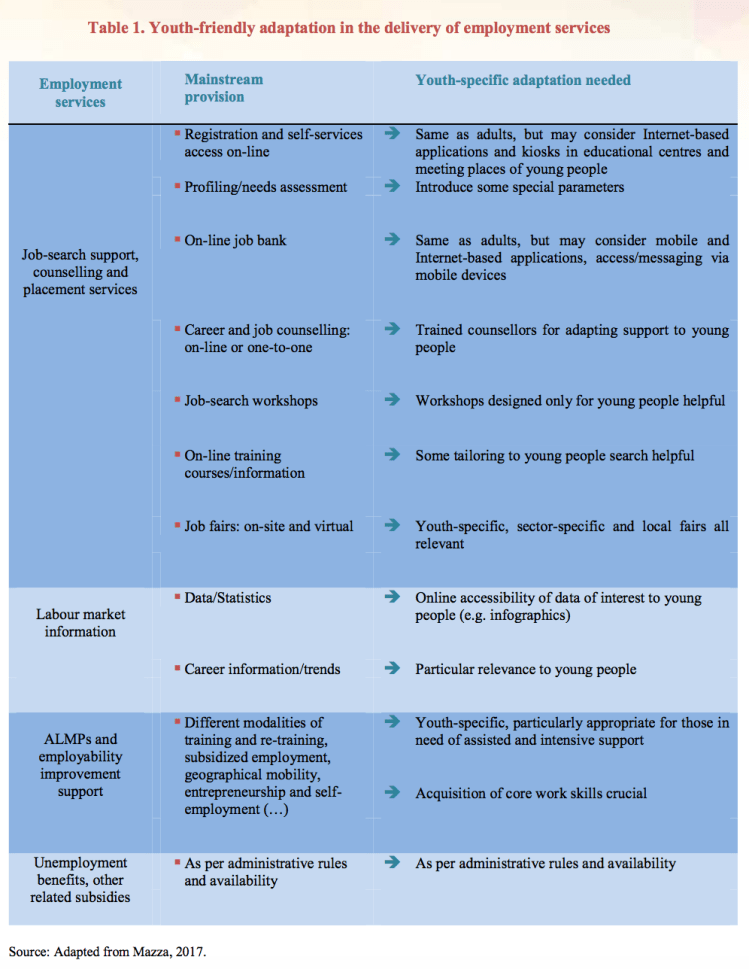 be achieved by making conventional employment services more accessible, including through online tools, social media platforms, and related activities that are modified or directed to serve young people particularly.