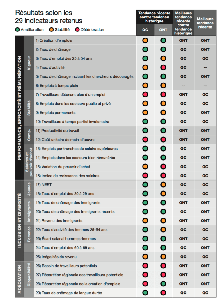 Quand on compare uniquement les tendances des trois dernières années dans les deux provinces, on constate toutefois que l’Ontario performe mieux que le Québec pour une faible majorité d’indicateurs. Autrement dit, le Québec s’est davantage amélioré comparativement à sa performance passée, mais l’Ontario continue de mieux performer dans l’absolu.