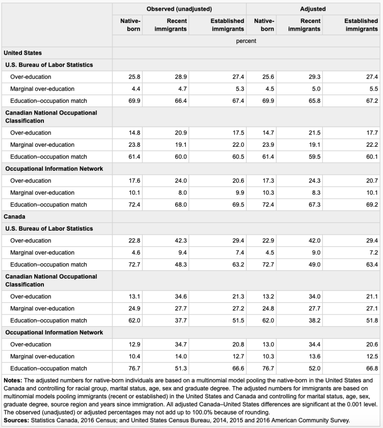 Table Over-education among workers with at least a bachelor’s degree, aged 25 to 64, United States (2014 to 2016) and Canada (2016)