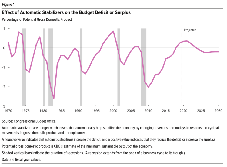 In this report, the Congressional budget Office projects the budgetary effects of those automatic stabilizers—as well as the size of deficits without them—from 2020 to 2030 and provides historical estimates of the stabilizers’