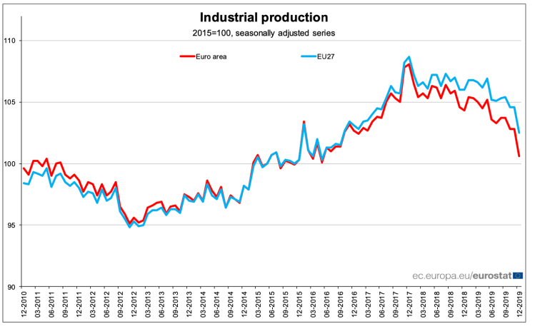 In December 2019 compared with December 2018, industrial production decreased by 4.1% in the euro area and by 3.9% in the EU27.