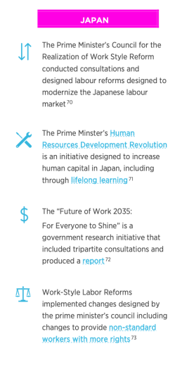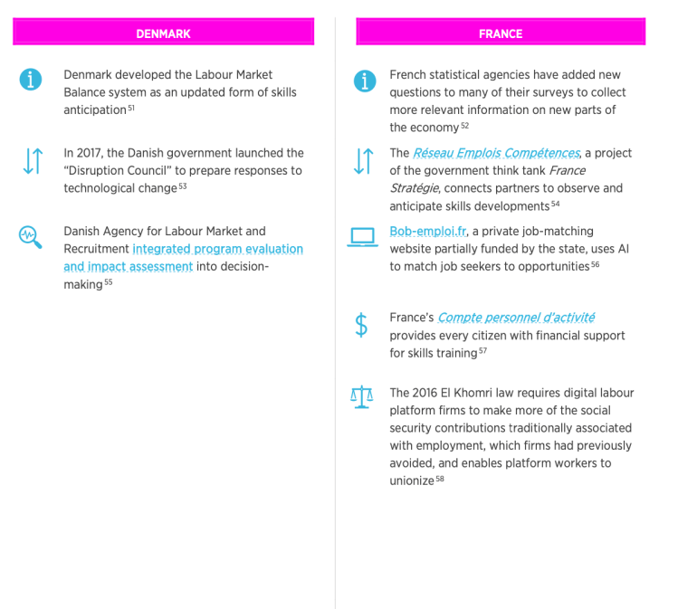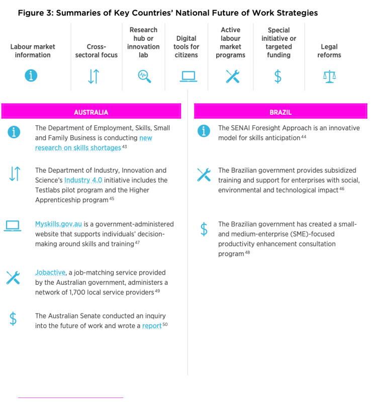 This elevated perspective is followed by a more in-depth discussion of one interesting initiative that is already underway in one of the selected countries. The goal is to understand what drives success in skills training initiatives along seven key dimensions of analysis, including labour market information, active labour market programs, special initiatives and legal reforms. Canada, and countries around the world, are positioning themselves to adapt to the future of work. This set of global comparisons aims to inform Canada’s approach to the future of work and skills, which is outlined in the final section of this report. With this information, the Future Skills Centre and policymakers can better grasp opportunities to help Canadians equip themselves with the skills they will need to thrive in the future of work.