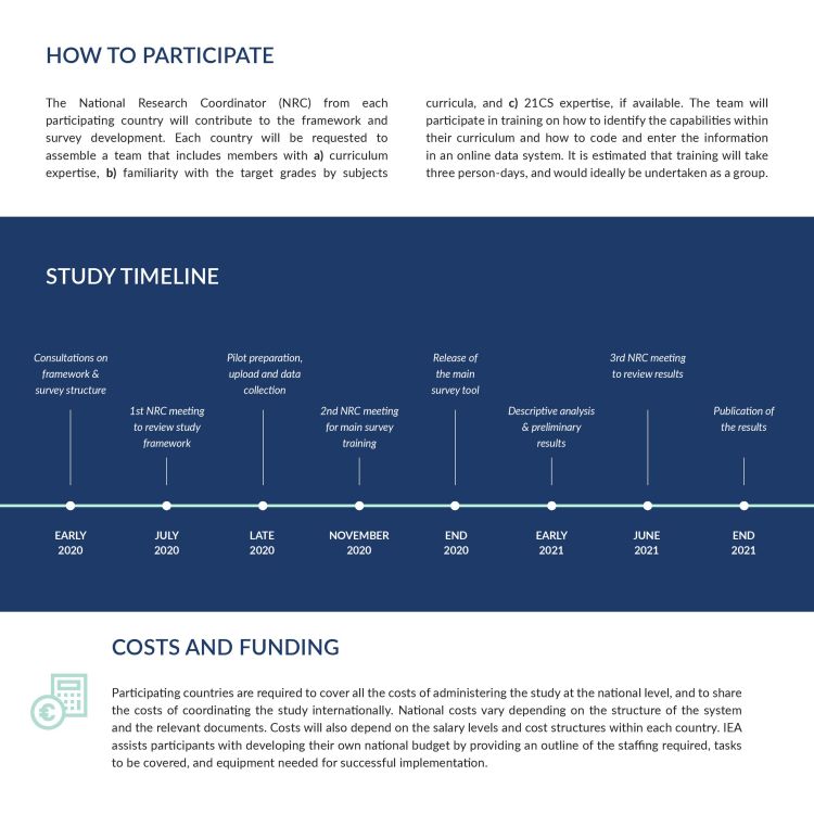 21CS MAP will look at what competencies are valued within mainstream education systems, how they are integrated, and the expectations for how students will learn, think, and perform. The study will first identify common 21CS across participating countries, and then analyze how these skills are represented across selected subjects at Grades 4 and 8 levels in national curricula. Consistent with IEA’s approach, participating countries will contribute to the study’s framework and survey to ensure relevance and accurate representation.