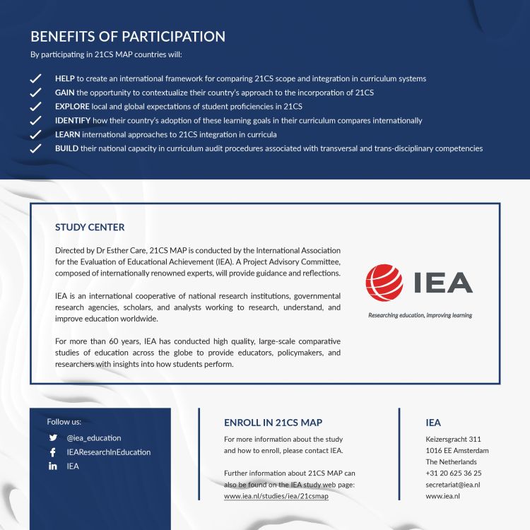 21CS MAP, a new study from the International Association for the Evaluation of Educational Achievement (IEA), is designed to address this issue. By taking a comparative curriculum-mapping approach, the study will analyze how curricula give students the opportunity to master 21st century skill (21CS) learning goals.