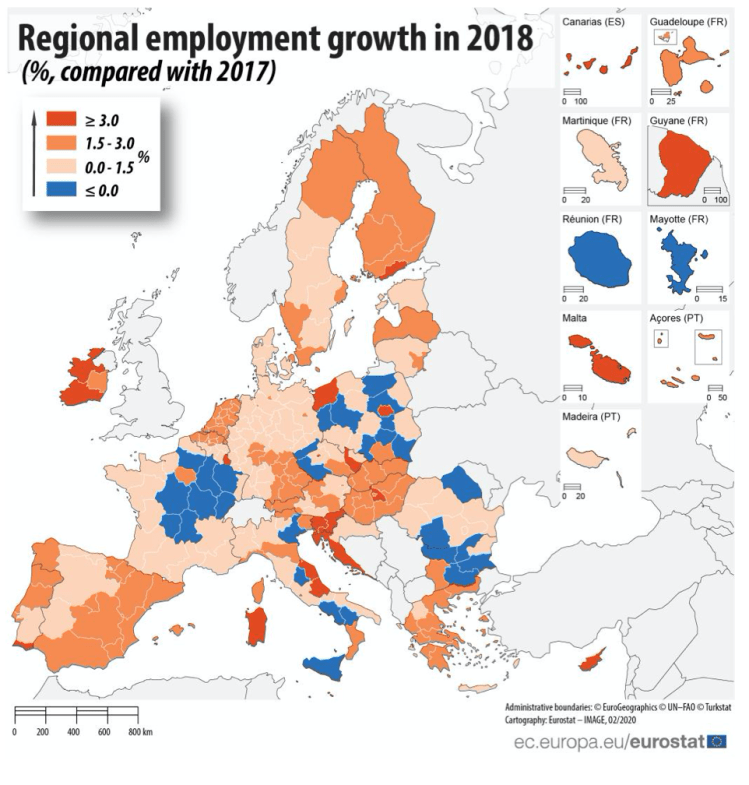 In 2018, 208 of the 240 EU regions (87%) saw their employment grow, while in 5 regions the number of persons employed remained stable and in a further 27 regions employment decreased.