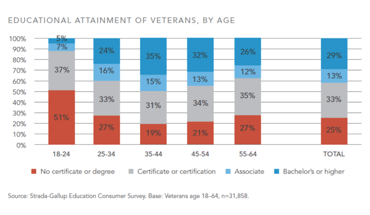 Prior research has shown that the skills and knowledge veterans gain in the U.S. military are often under-recognized and undervalued by civilian employers. This nationally representative survey, conducted in partnership with Gallup and the Lumina Foundation, draws on the perspectives of U.S. veterans to understand the educational attainment of veterans without degrees, the benefits their credentials bring them, and their attitudes toward pursuing additional education.