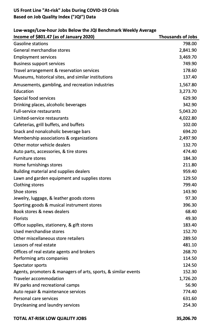 Chosen excerpts by Job Market Monitor. Read the whole story @ Statement from the U.S. Private Sector Job Quality Index (“JQI”) Team on Vulnerabilities of Jobs in Certain Sectors to the Covid-19 Economic Shutdown