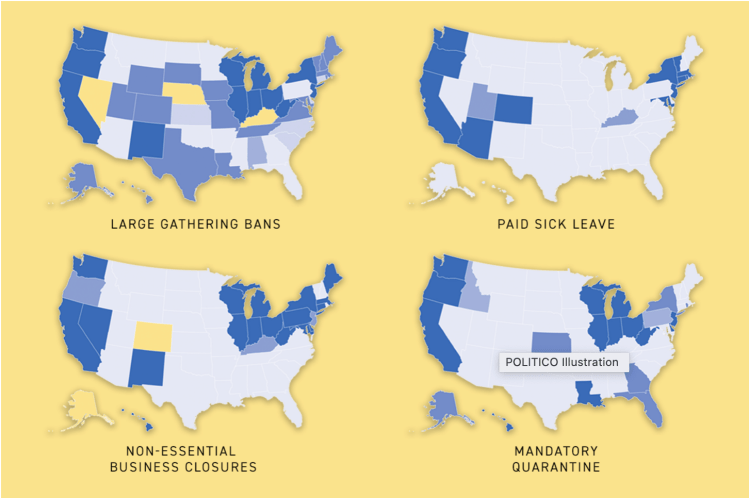 Chosen excerpts by Job Market Monitor. Read the whole story @ How states are responding to coronavirus, in 7 maps – POLITICO