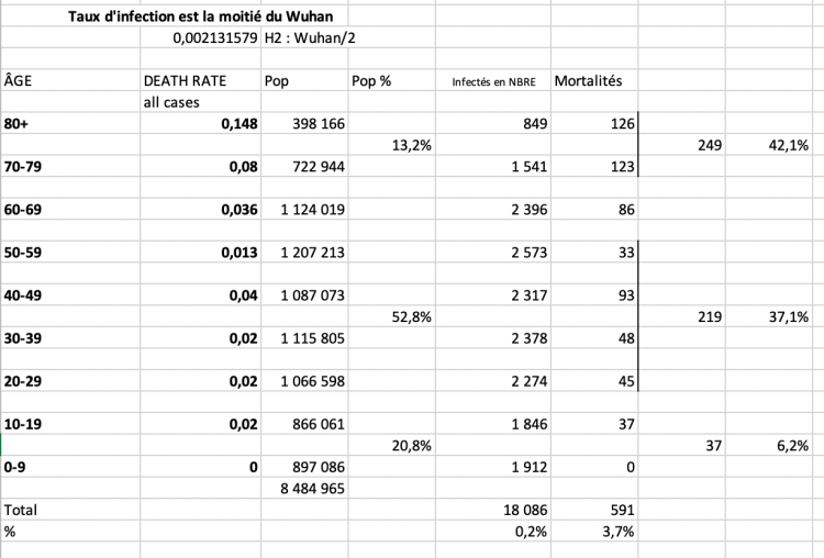 Nous avons utilisé les données de la Chine, mais avons calculé le taux d’infection comme s’il s’agissait seulement de la province du Wuhan. État donné qu’il semble maintenant certain que la Chine n’a pas comptabilisé tous les cas d’infection (les asymptotiques ne sont pas comptabilisés contrairement à ce que demande l’OMS), nous avons produit des calculs avec un taux d’infection de 1/2 de celui du Wuhan pour en tenir compte. Voici ce que cela donnerait pour le Québec :