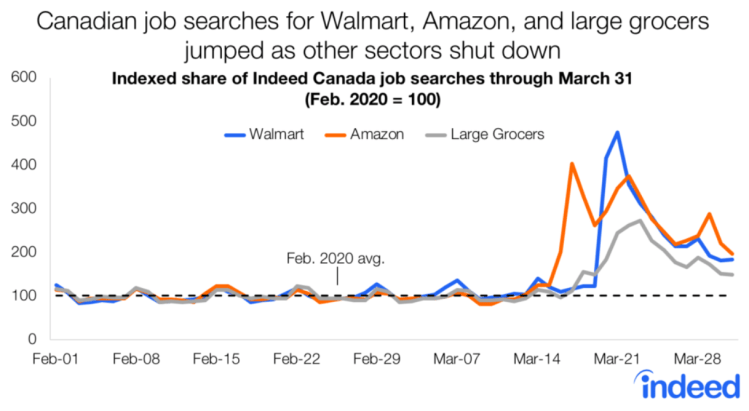Grocery stores and household delivery services have become key pillars of the economy amid the COVID-19 crisis. Canadian job seekers have taken notice. As companies like Walmart and Amazon announced major hiring plans, job searches for both on Indeed Canada surged, along with those for large grocers including Costco and Loblaws.*