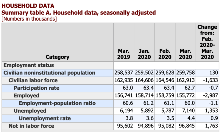 In March, the unemployment rate increased by 0.9 percentage point to 4.4 percent. This is the largest over-the-month increase in the rate since January 1975, when the increase was also 0.9 percentage point. The number of unemployed persons rose by 1.4 million to 7.1 million in March. The sharp increases in these measures reflect the effects of the coronavirus and efforts to contain it. (See table A-1. Measures from the household survey pertain to the week of March 8th to March 14th.)