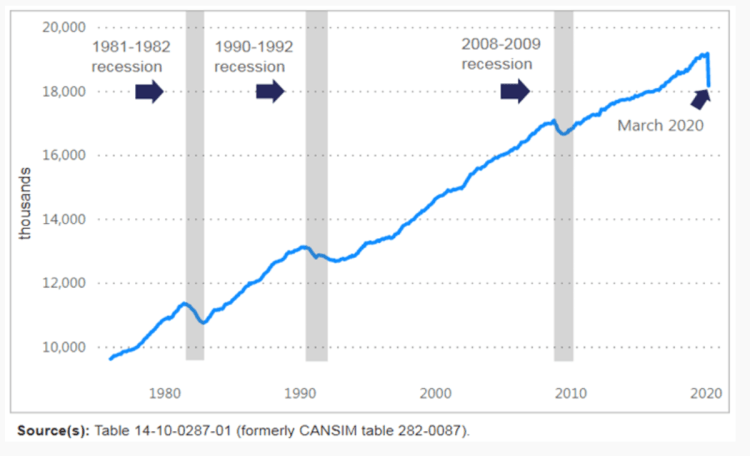 The March Labour Force Survey (LFS) results reflect labour market conditions during the week of March 15 to 21. By then, a sequence of unprecedented government interventions related to COVID-19—including the closure of non-essential businesses, travel restrictions, and public health measures directing Canadians to limit public interactions—had been put in place. These interventions resulted in a dramatic slowdown in economic activity and a sudden shock to the Canadian labour market. The slowdown continued beyond the LFS reference week and is likely to be more fully reflected in April LFS data.