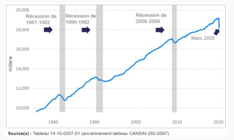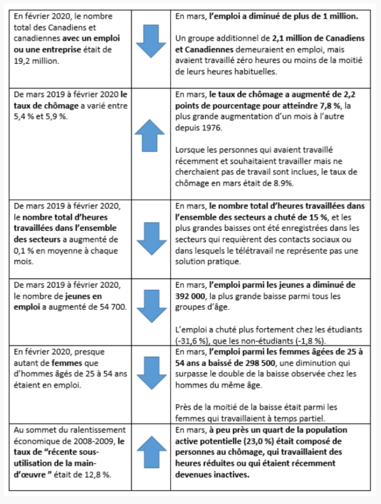 Le taux de chômage a augmenté de 2,2 points de pourcentage pour s’élever à 7,8 %. Il s’agit de la plus forte hausse mensuelle enregistrée depuis 1976, année où des données comparables ont commencé à être publiées. Le nombre de chômeurs a augmenté de 413 000 (+36,4 %), principalement en raison des mises à pied temporaires. Par ailleurs, le nombre de Canadiens qui avaient travaillé récemment et qui souhaitaient travailler, mais qui ne répondaient pas à la définition de chômeurs, a augmenté de 193 000.