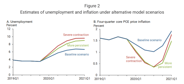 Figure 1 shows the simulated paths of unemployment and four-quarter core PCE price inflation in response to the baseline scenario for the two policy alternatives. With the aggressive policy (blue lines), unemployment reaches 6.8% in the last quarter of 2020, and inflation falls to as low as 1%. If policy is slower to adjust (green lines), then unemployment reaches 10.4% in the first quarter of 2021 and inflation falls as low as –1.4%, which are much worse outcomes. This shows that the failure to anticipate dire conditions can be compounded by limited policy space to yield substantially worse outcomes.