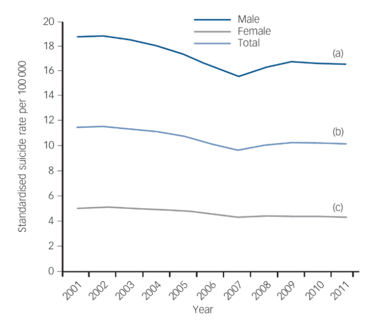Fig. 1 European Union age-standardised suicide rate for the total population (b), and for males (a) and females (c), 2001-2011.