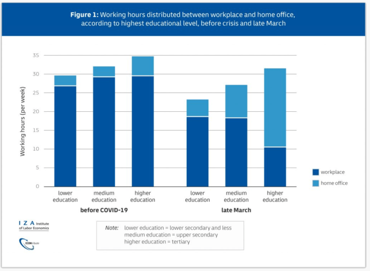 The total share of employees who work from home at least two hours a day has doubled from 27 to 54 percent. This is mainly driven by high-skilled workers (76 percent) while only 31 percent of low-skilled workers report at least two home office hours per week since the beginning of the crisis. For university graduates, switching to telecommuting seems relatively easy: While their share of home office hours increased from 11 to 68 percent, the share among the low-educated is only one-fifth. The latter group, instead, experienced a much larger drop in total hours (see Figure 1).