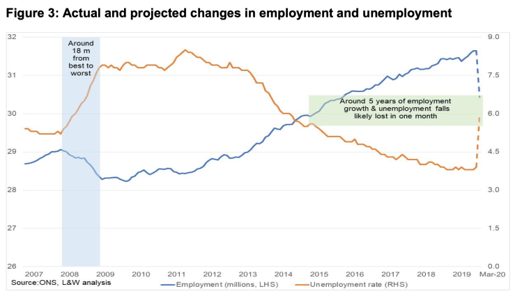 The result has been the sharpest spike in unemployment on record. There were one million claims for Universal Credit in a two week period, 7.3 times higher than the same period one year ago. Gains in employment over the last five years have been lost in just one month, with unemployment already likely to be at least 50% higher.