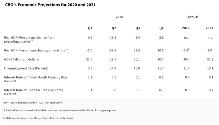 In the second quarter of 2020, the economy will experience a sharp contraction, and CBO’s current economic projections include the following: