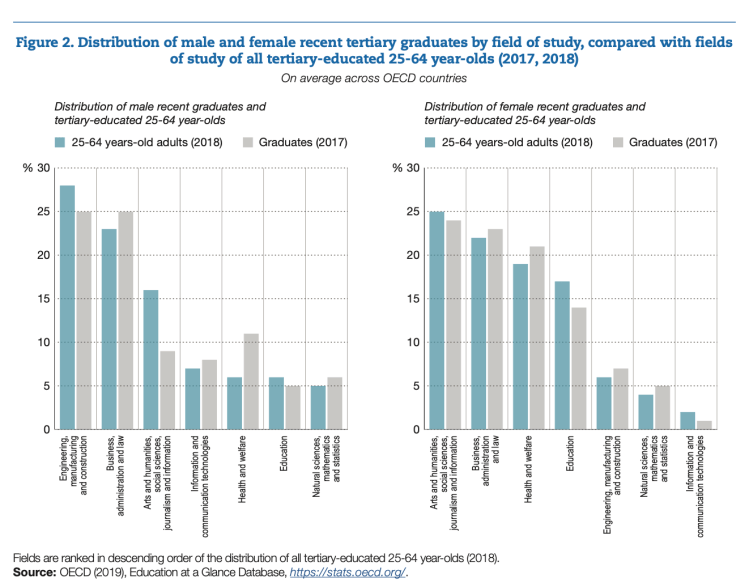 Women’s participation in higher education has overtaken men’s. However, women have been historically under-represented in some fields and continue to be so: they predominate in education,and health and welfare as their main fields of study, while men predominate in science, technology, engineering and mathematics. Whatever field of study they choose, however, women’s earnings still lag behind men’s in all fields and in all OECD and partner countries.
